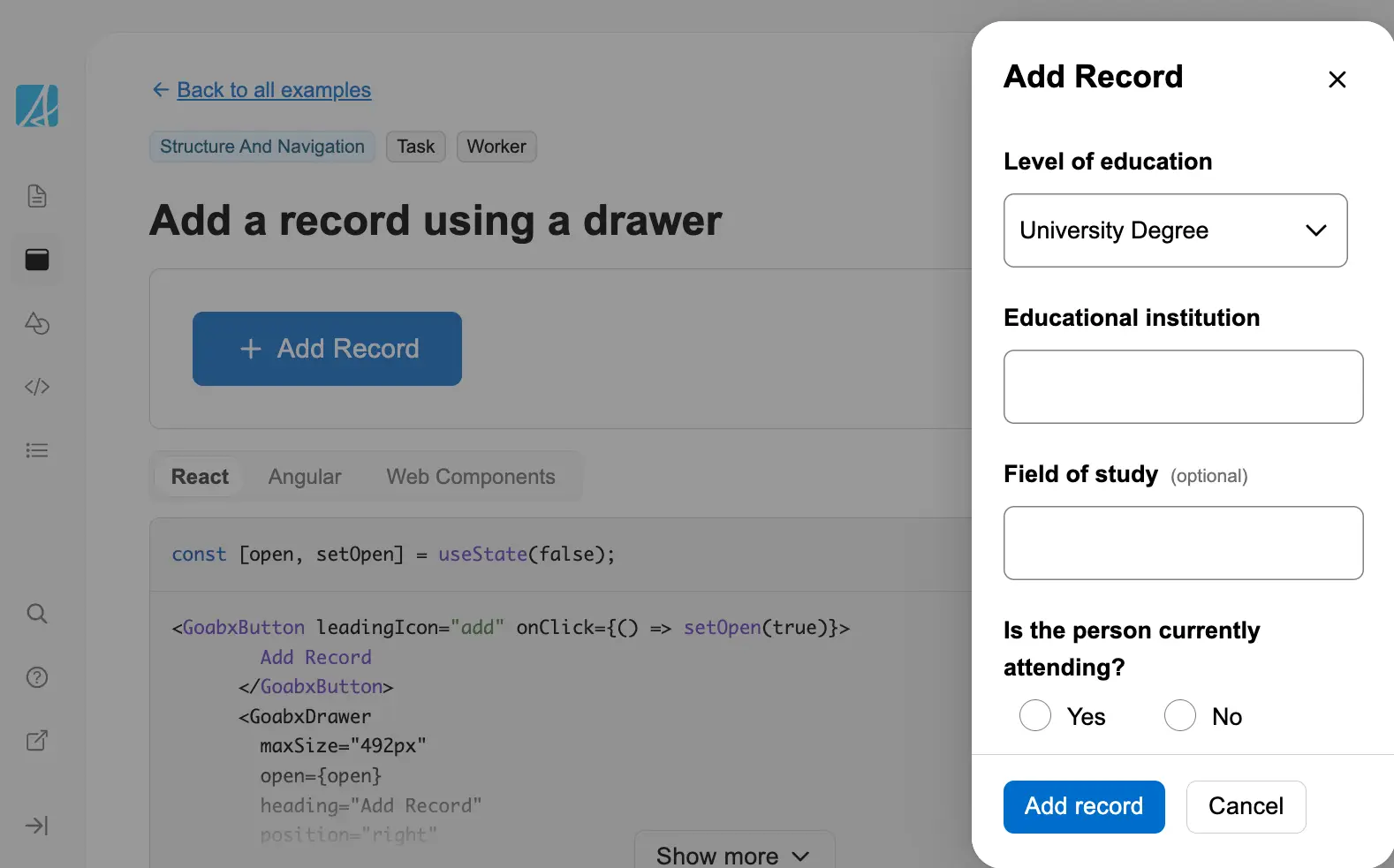Add a record using a drawer. The drawer slides in from the side to allow data entry without navigating away from the cur...