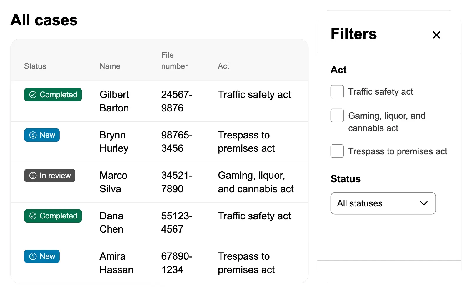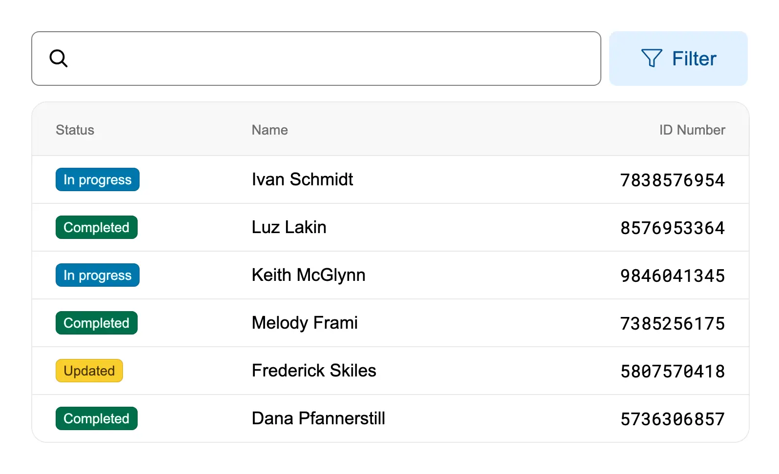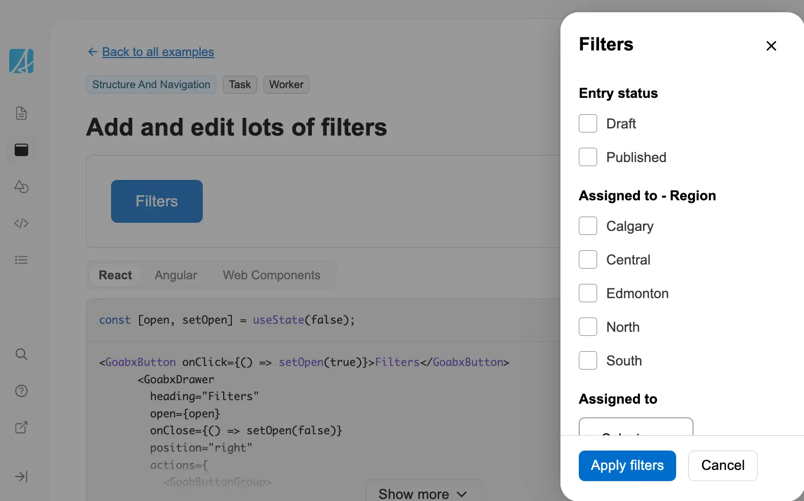 Use a push drawer to house filters alongside a list of records. The push drawer keeps the filter controls accessible whi...