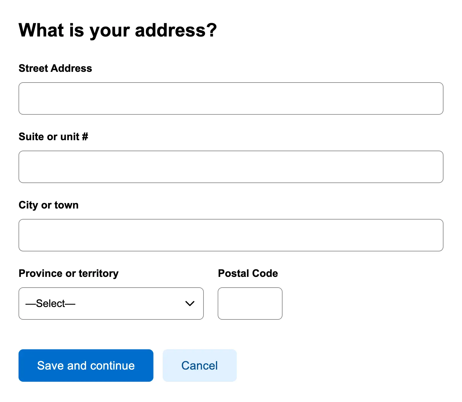 Collect a complete mailing address from the user, including fields like street, city, and postal code.