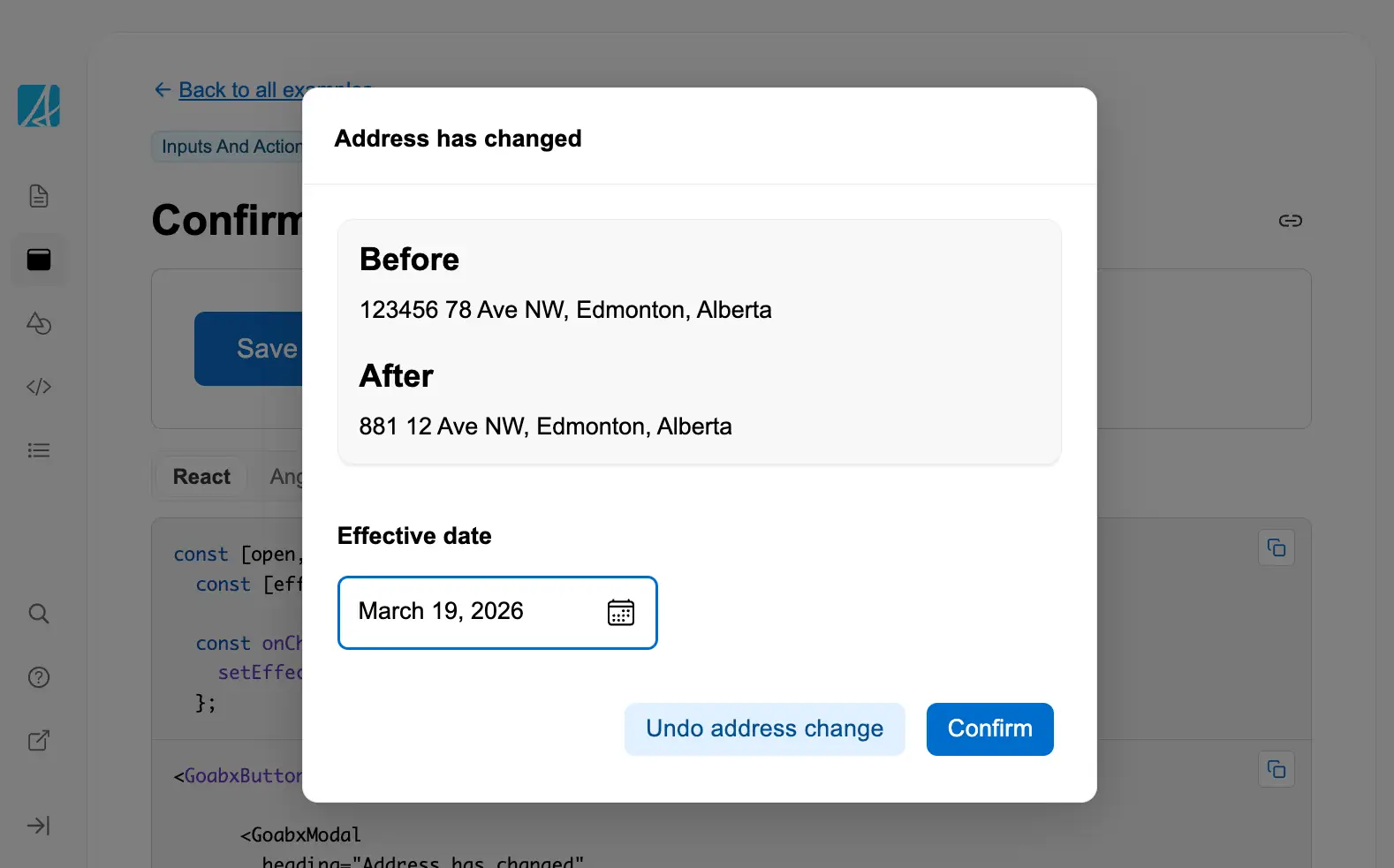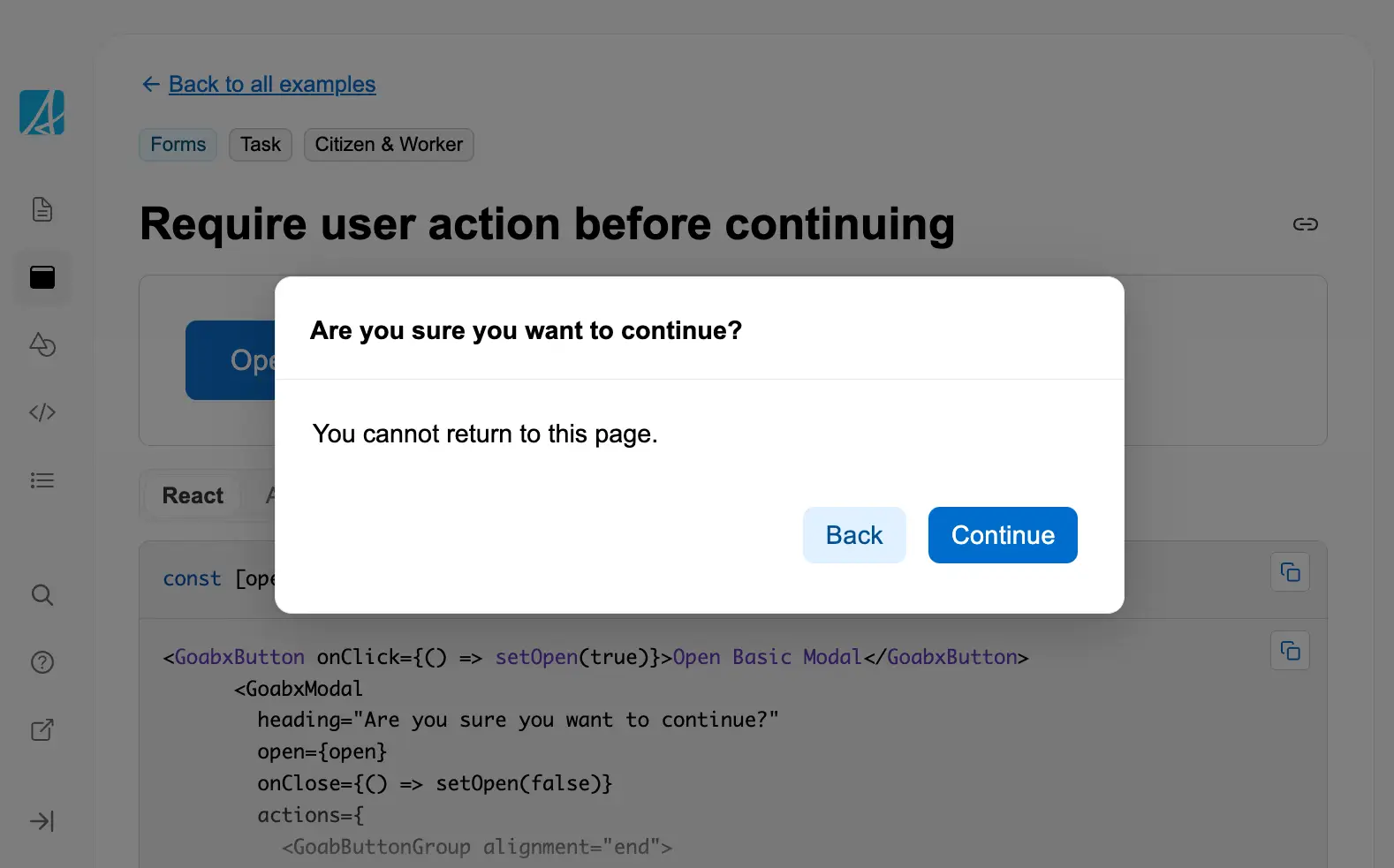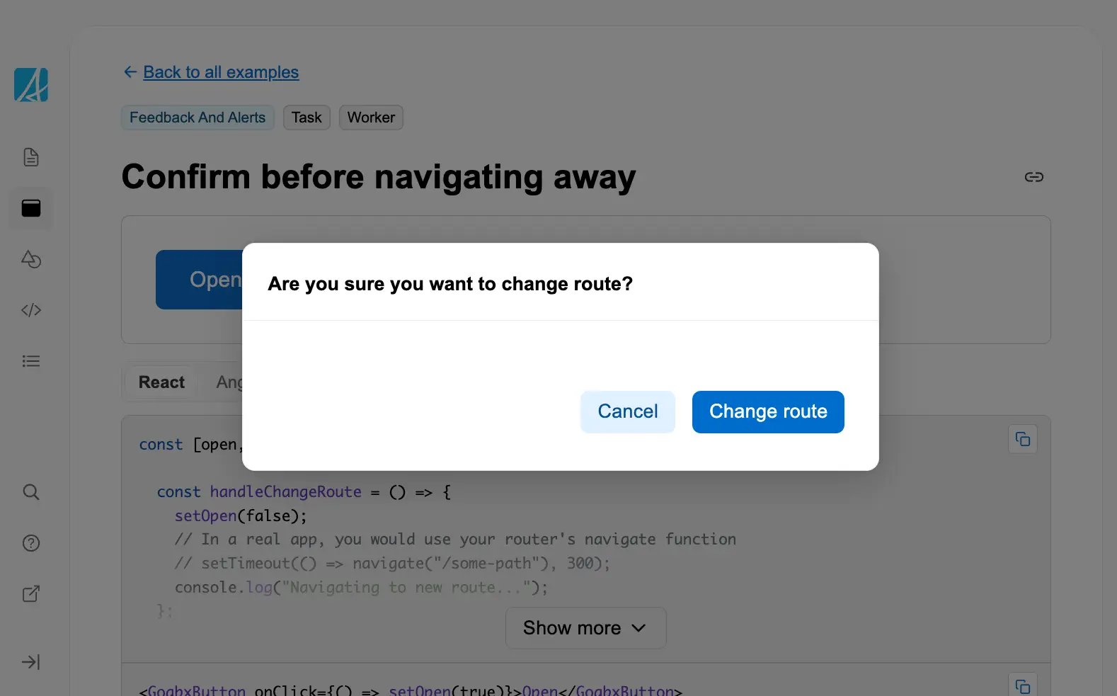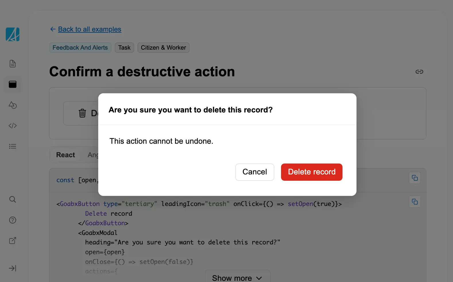 Use a modal dialog to require users to confirm an action before proceeding, especially for irreversible operations or im...