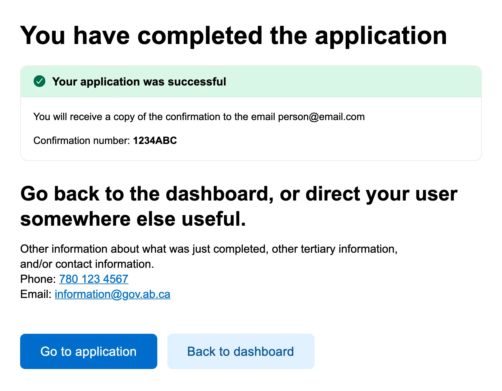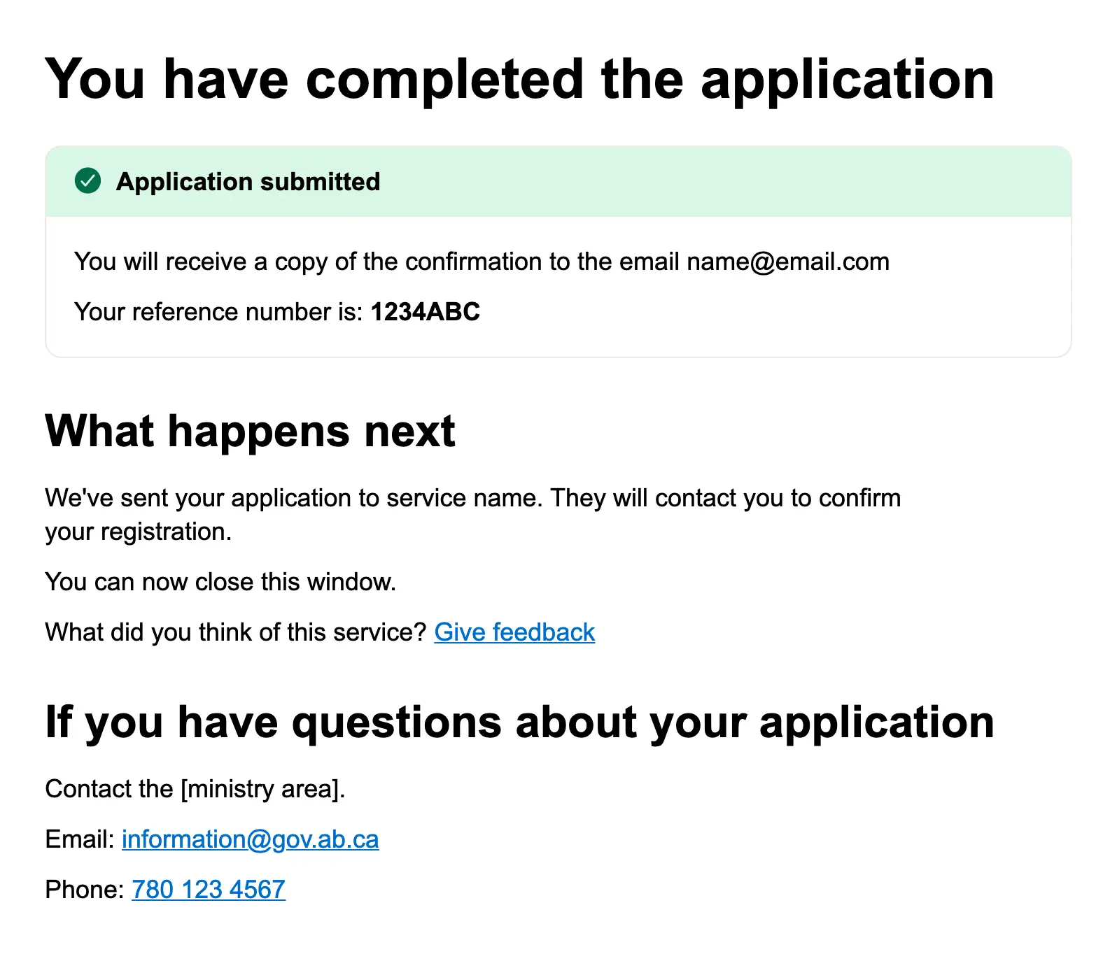 A result page shown after form submission to confirm success, provide next steps, and offer relevant contact information...