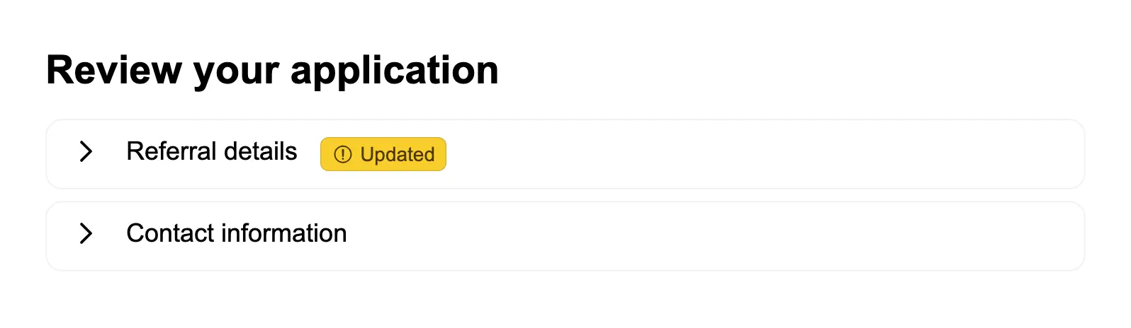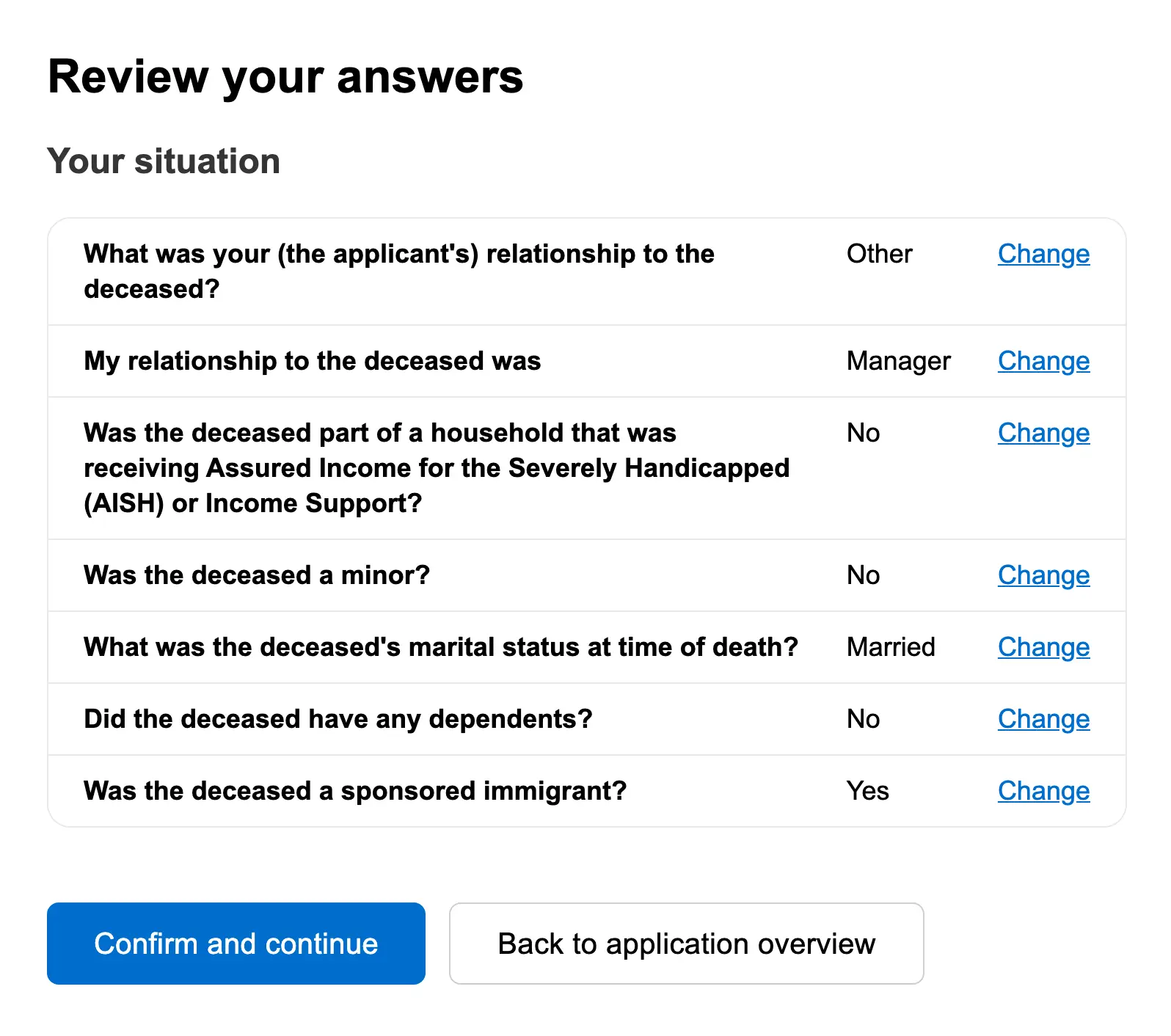 A review page where users can check their answers before submitting a form, with options to change individual responses.