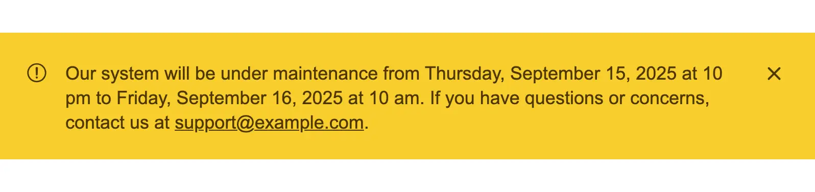 Display a clear message to inform users about an upcoming service outage, including the date, time, and expected impact ...