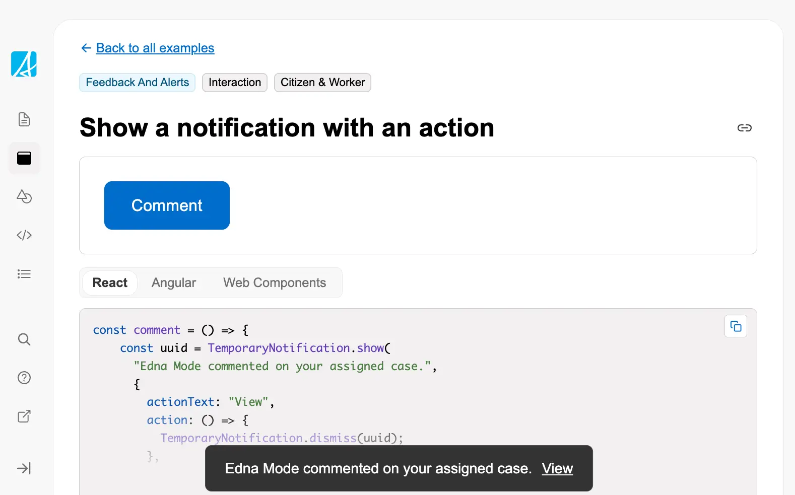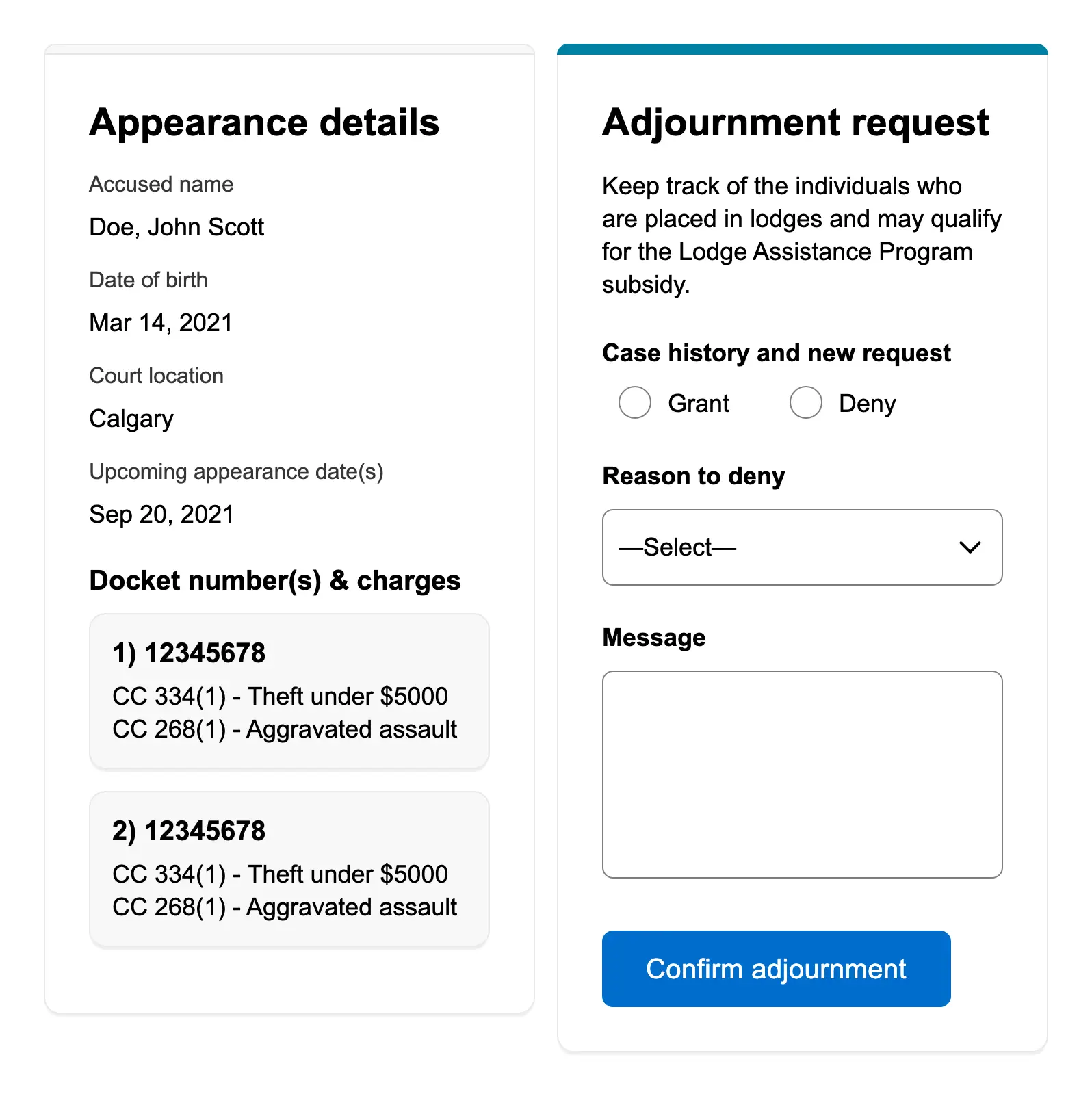 A side-by-side layout for workers to review case details while taking an action, commonly used in case management and ap...
