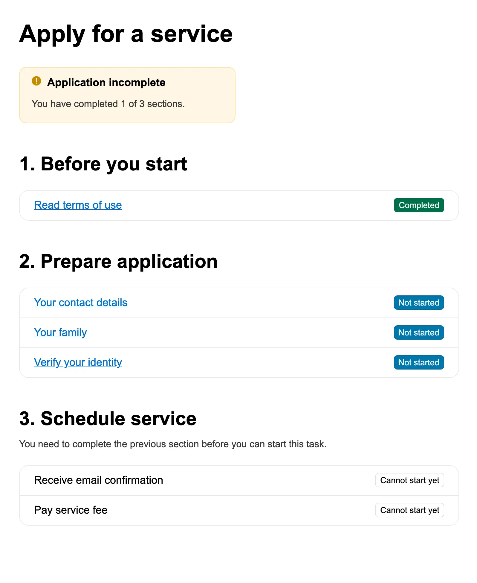 A task list page provides a structure for multi-step services, showing users their progress through a series of tasks wi...