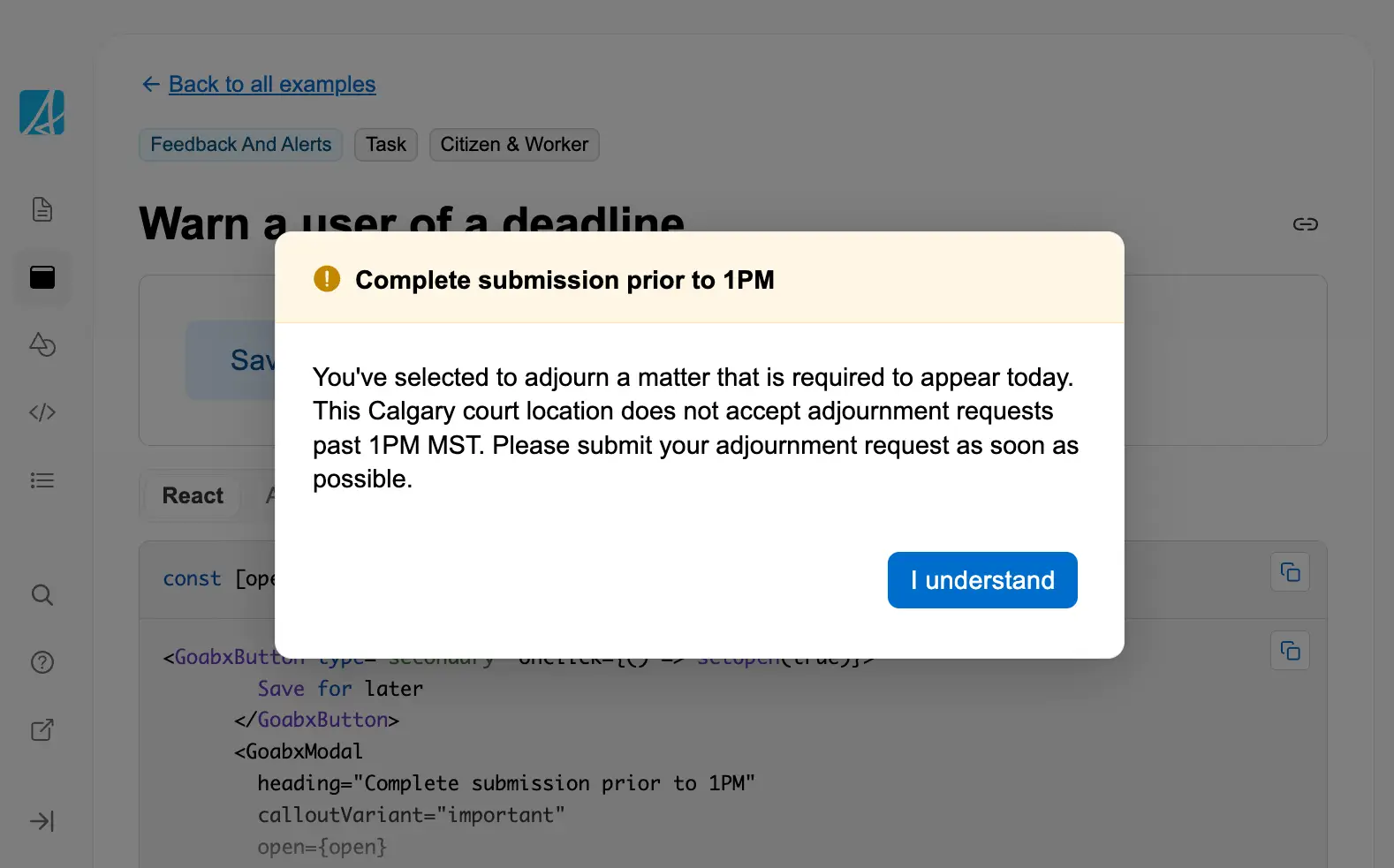 Use a modal with important callout styling to warn users about time-sensitive deadlines that could affect their submissi...